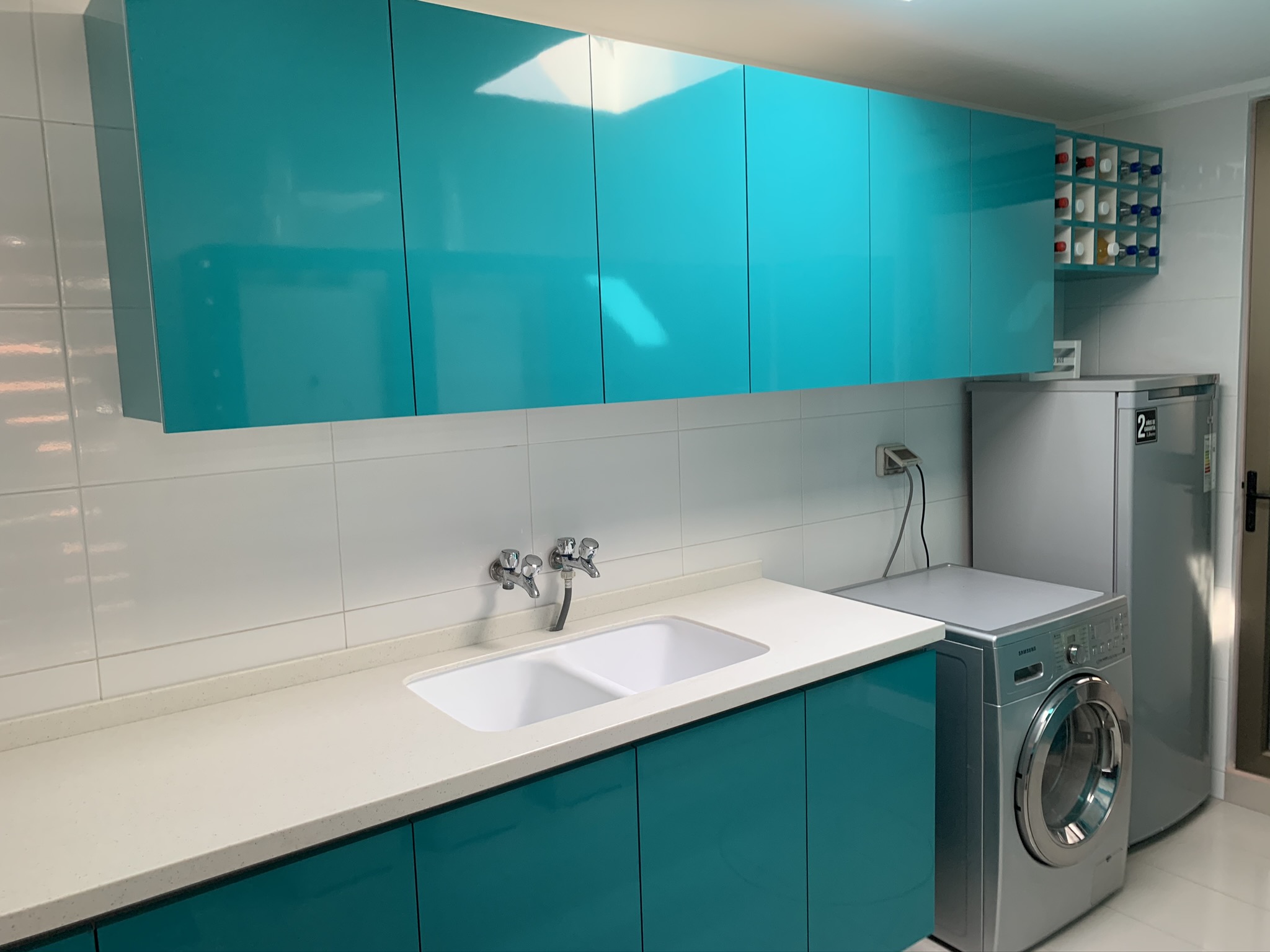 Mobiliario logia, estructura en melamina blanca frentes y cantos en laminado plástico de alta presión turquesa brillante, sistema de apertura y extraíbles con cierre suave. Mesón perimetral con puertas de abatir y repisas interiores, tirador gola aluminio, Cubierta y Lavadero doble en Staron. Cava superior, muebles colgantes, cierre de calefonts. Colgador metálico tipo parrilla com sistema de guardado abatible a muro.